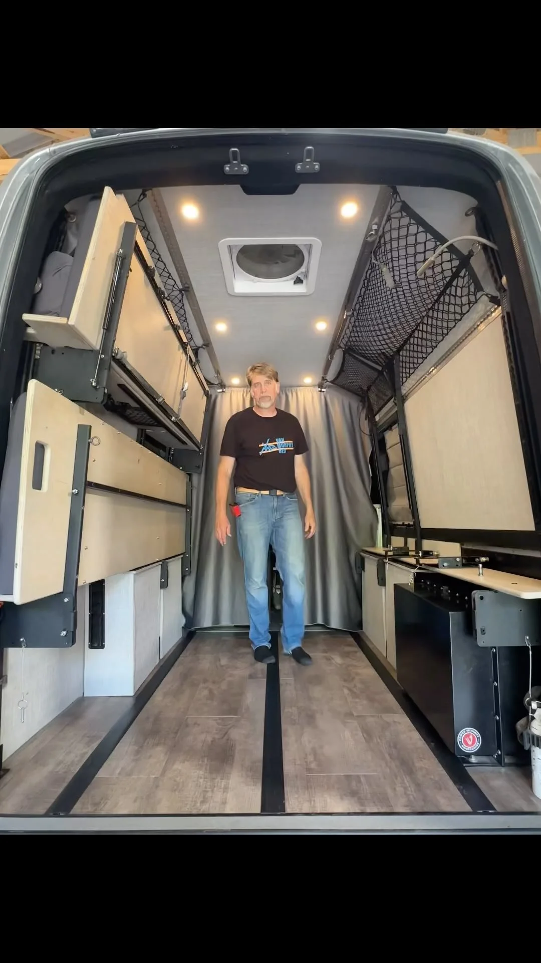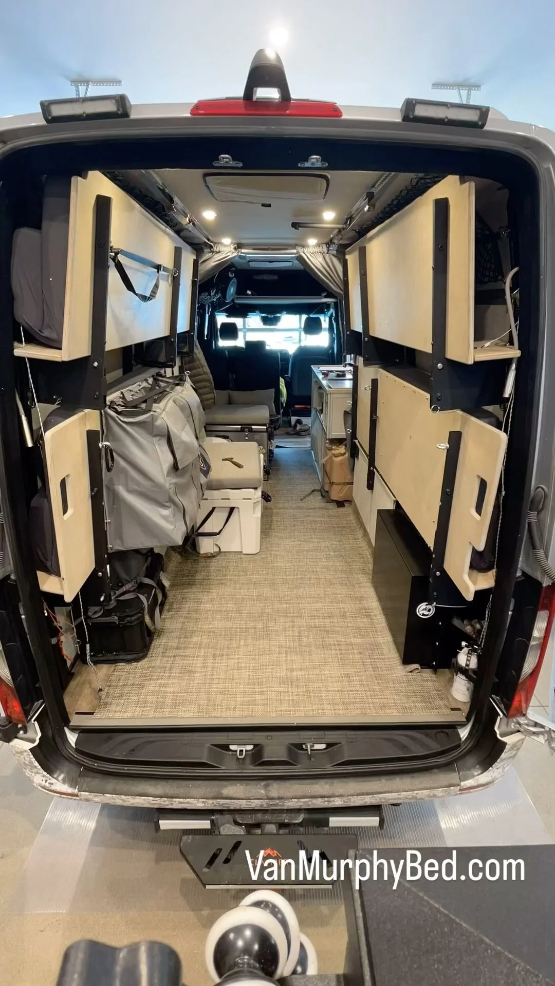 “2023 Transit LWB, High Roof with Van Murphy Bed system. We love our Van Murphy Beds!! We had planned to build a bike garage with a fixed bed system in our 2023 Ford Transit before speaking with Ted Barron of Van Murphy Beds. The bed system folds out of the way in seconds and frees up the entire length of our van for living space. We travel with bicycles (4) under the bed and can fold the beds down and sleep without moving the bikes around when traveling. We are on year two of our travels with these beds and are 100% satisfied with our purchase.”